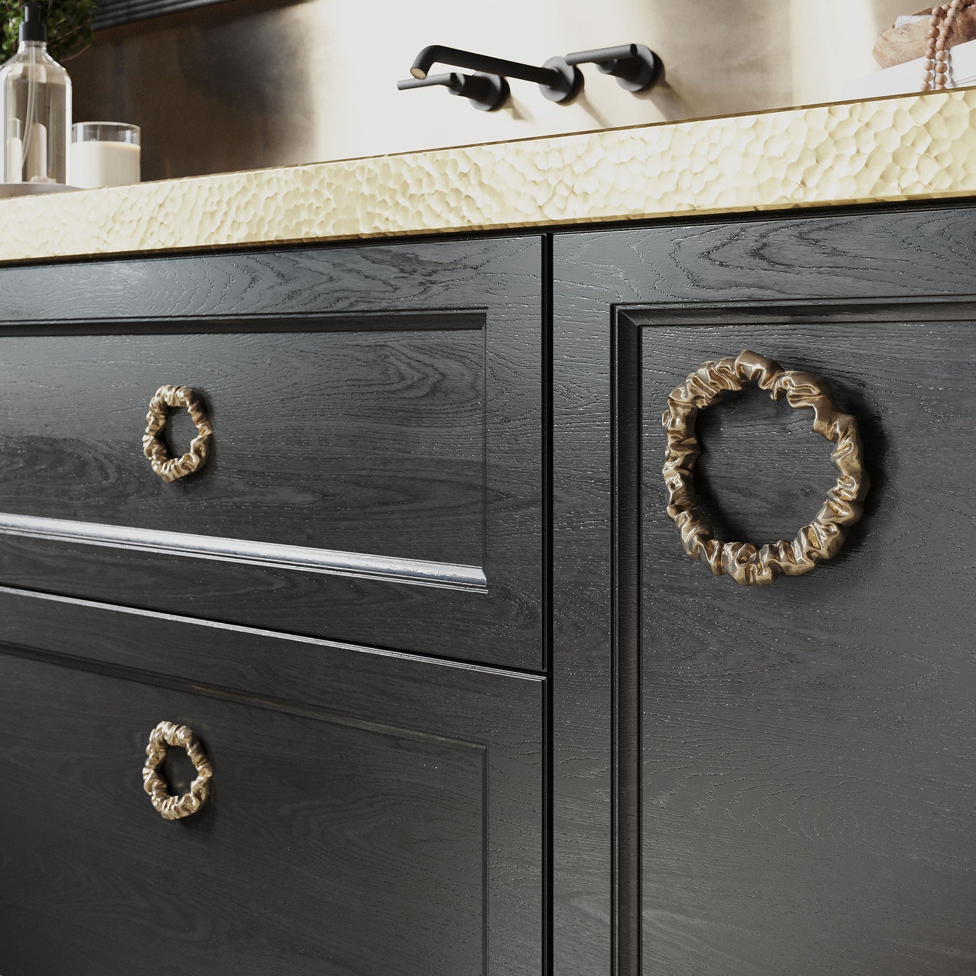 The Blair medium pull handle is distinguished in design and invokes a ruffled circle motif. This organic shaped circle has a slight upturn angle for easy grasping and will add intriguing character to drawers, cabinets, and furniture items. Would make a statement in a primary bath or powder room. Available in two sizes.
