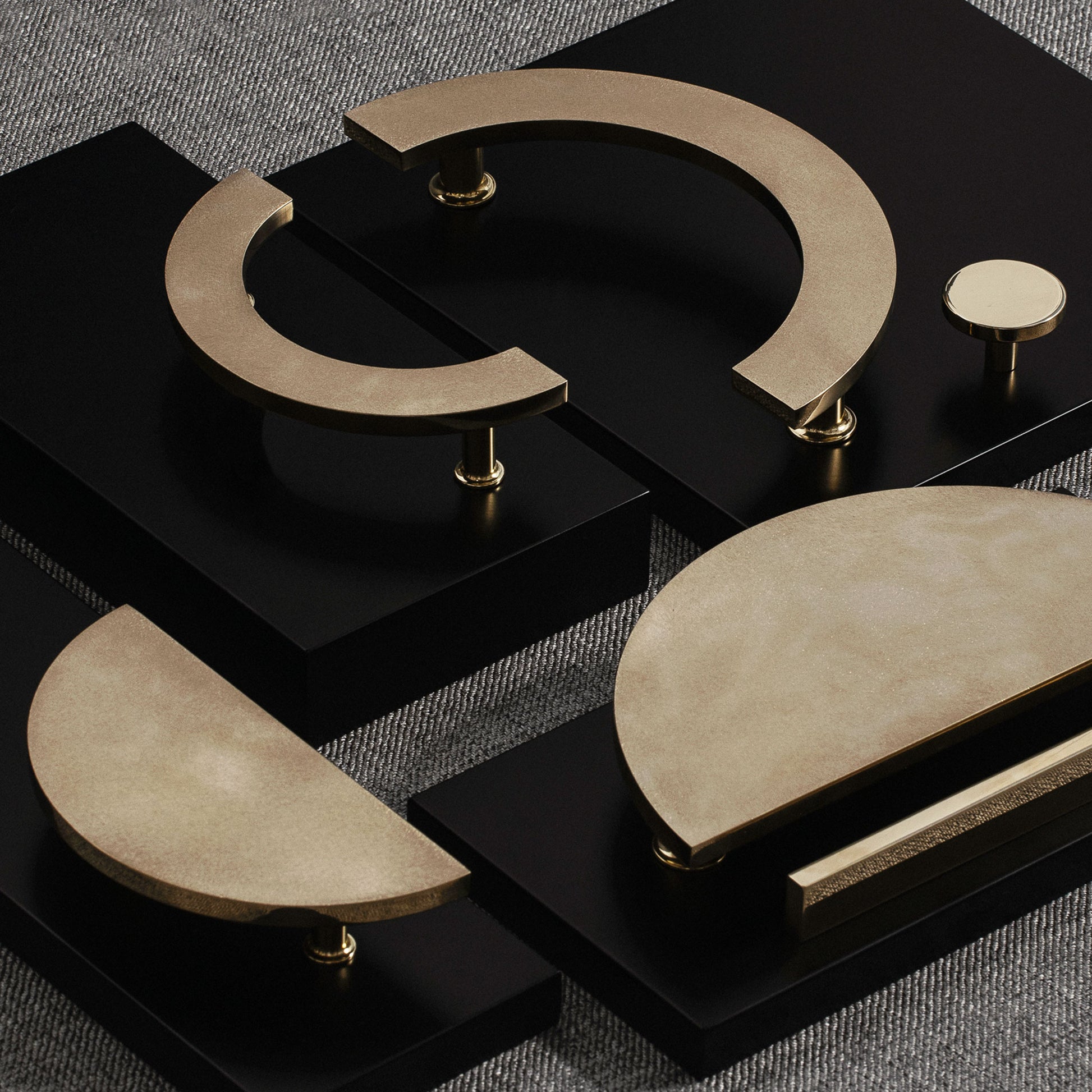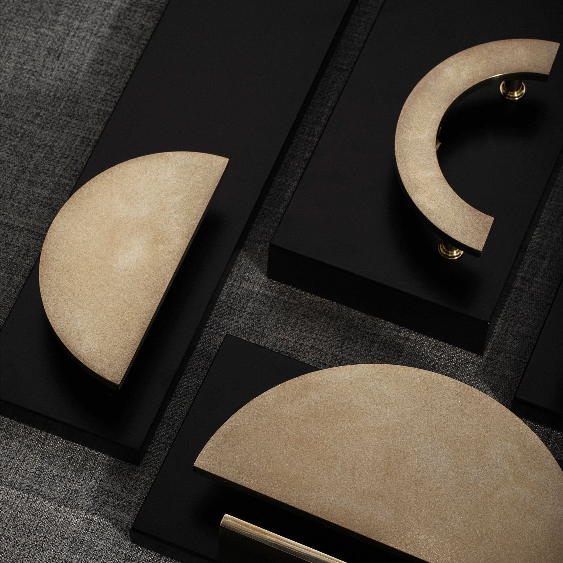 The Friz pull handle is distinguished in simplicity and invokes a subtly textured half ring. This half-round pull is both modern and with the slight texture, still organic in feel. These half-round pulls will add intriguing character to drawers, cabinets, and furniture items. Use two to create a full circle across two double doors.
